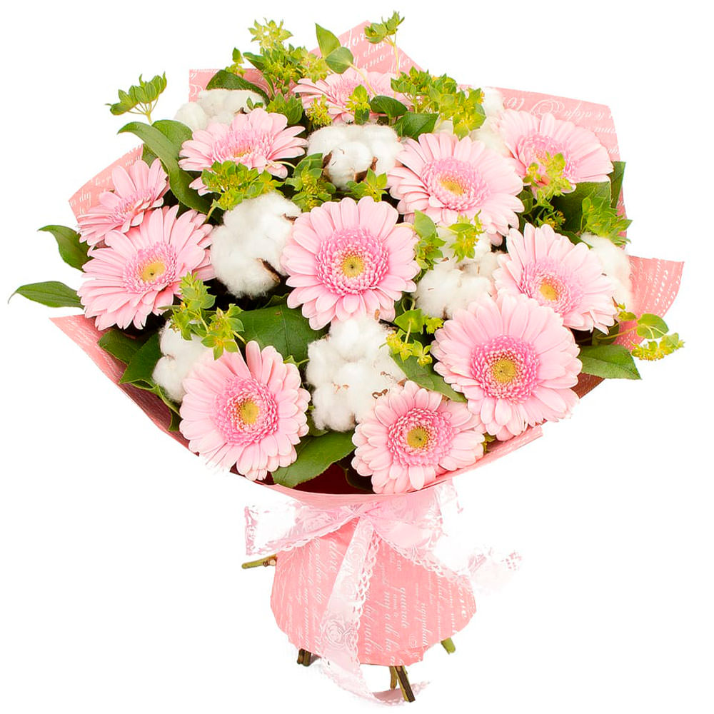 Гербера, хлопок, экзотическая зелень.